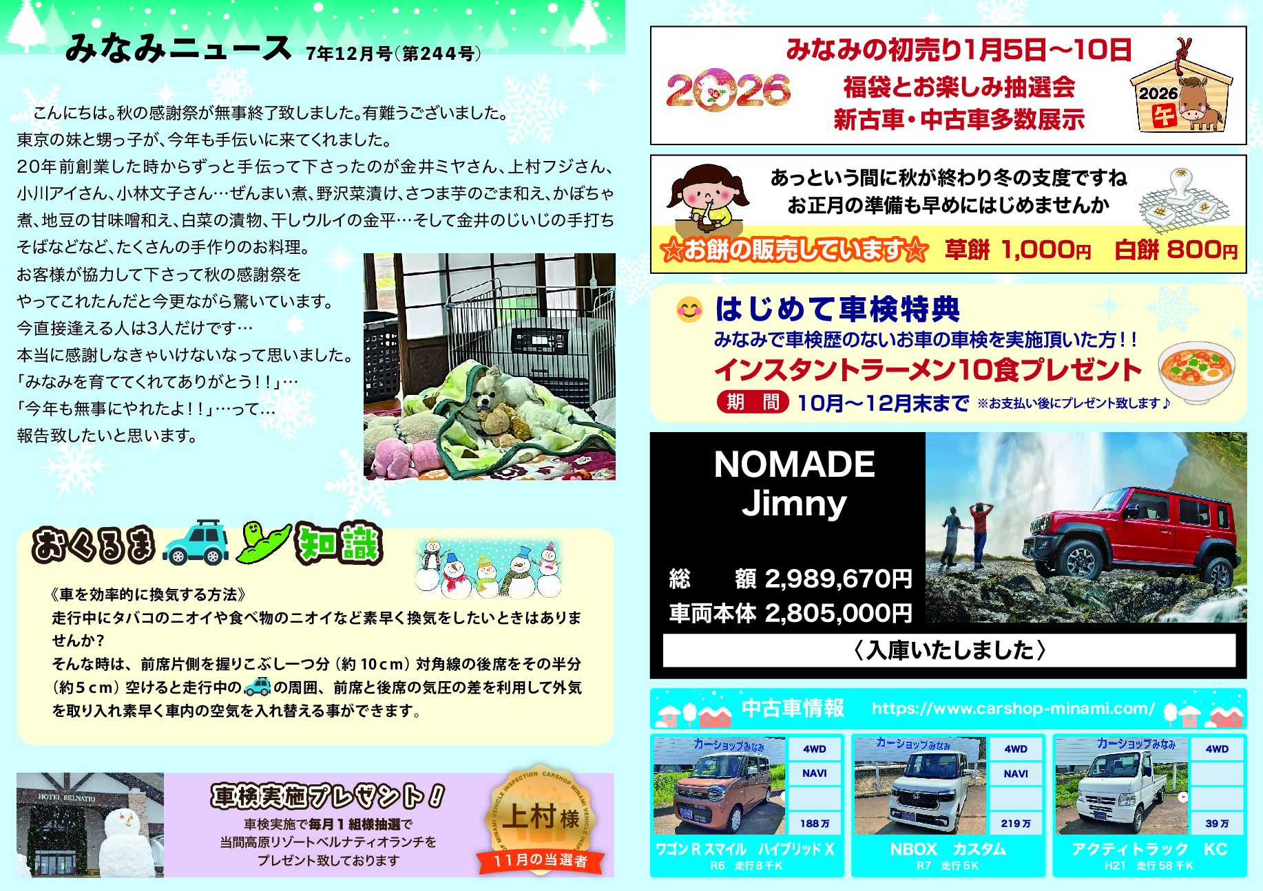 当店で車検をご利用いただいたお客様の中から毎月抽選でペア1組「当間高原リゾートベルナティオ ランチ」をプレゼント!車検の際は是非ご利用ください!