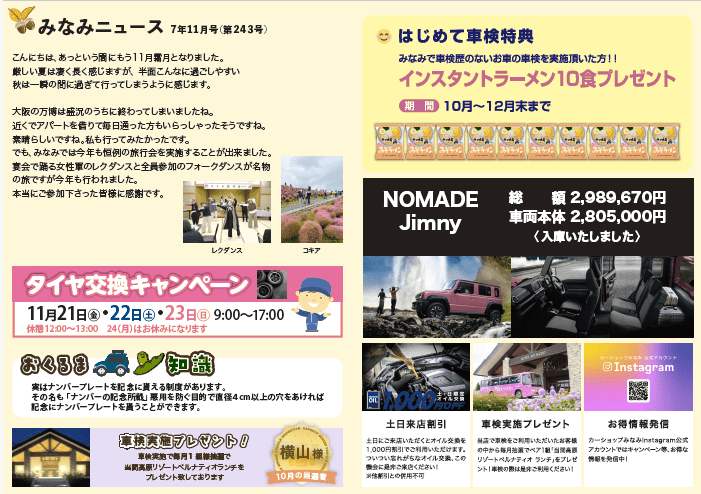 土日にご来店いただくとオイル交換を1,000円割引でご利用いただけます。ついつい忘れがちなオイル交換、この機会に是非ご来店ください!
